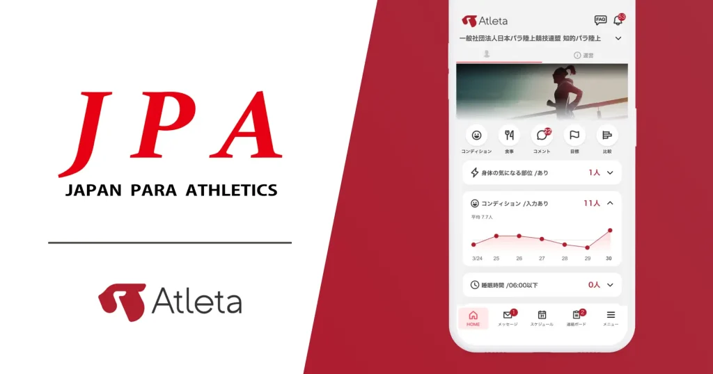 選手のデータ管理とチームコミュニケーションを支えるプラットフォーム「Atleta(アトレータ)」を展開するクライムファクトリー株式会社は、このたび日本パラ陸上競技連盟の知的障害ブロックにおいて、強化・育成活動における情報共有およびコンディション管理ツールとして「Atleta」が導入されたことをお知らせします。